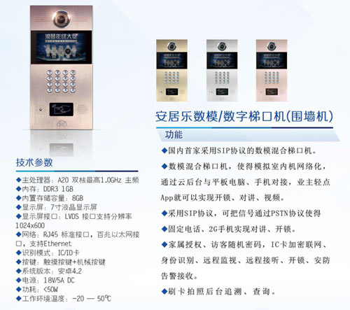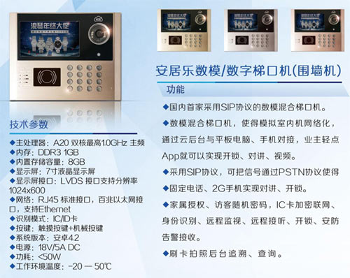 安居樂數字對講系統把模擬信號和數字信號融為一體,安居樂數字后臺搭建業主、物業管理、周界商圈、廣告經營、O2O的大數據交流平臺,充分發揮各自優勢資源,共同營造增值空間,體現各自社會價值。讓用戶切身體驗到:"家就在眼前,社區就在身邊,世界就在指尖,生活就在安居樂。"