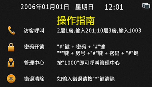 1) 門口機待機時的主界面,包括時間日期顯示,網絡是否在線,訪客呼叫、密碼開鎖、呼叫中心以及使用說明,如圖3.1.1: