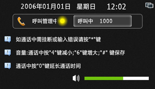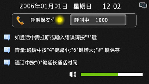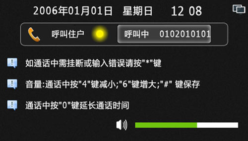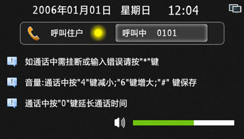 4) 輸入房號時錯誤,可按“*”鍵清除,呼叫或通話過程中按“*”鍵可退出或結束通話,通話中按“4”或“6”可減小或增大音量,通話中按“0”鍵可延長通話時間至60秒。