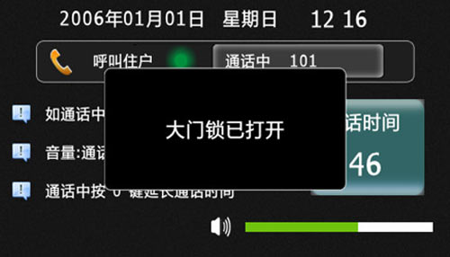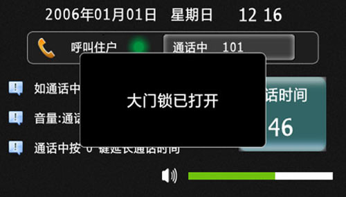 6) 呼叫業主或和業主通話時,業主通過室內機遠程開鎖,門口機將顯示“大門鎖已打開”如下圖3.2.5: