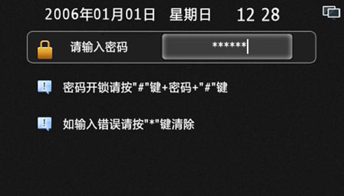 1) 設置機器的時間和日期,如果設置時間不合理,則會提示設置失敗。設備開機或運行時會自動同步物業中心軟件的時間。格式為安居樂X-XX-XX XX:XX,例如2006-1-1 12:00,“*”鍵可清除錯誤輸入,“#”確定保存并退出,設置界面如圖4.10.1: