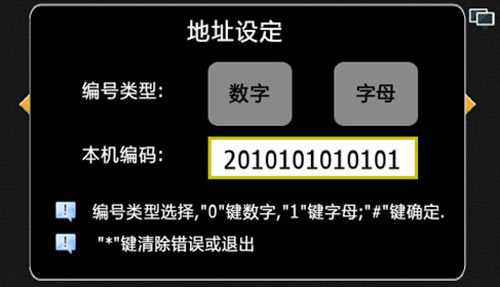 1) 進入系統設置:主界面輸入“#”+6位管理員密碼+“#”(出廠默認管理員密碼為666666),進入系統設置界面,“*”鍵退出或清楚錯誤輸入功能,“#”鍵為確定功能,“4”和“6”左右移動選擇,進入時默認為地址設定,如圖4.1.1: