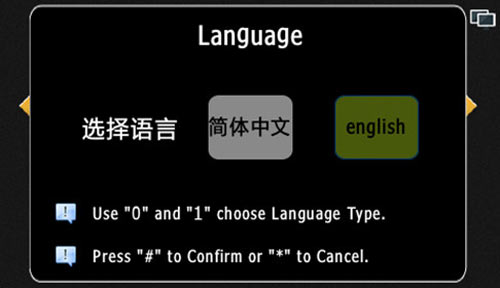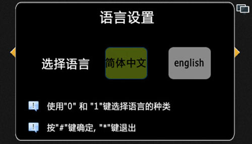 1) 設置機器的語言,默認為中文顯示,按“0”選擇中文,按“1”選擇英文,“*”鍵退出,“#”保存并退出,中文和英文顯示如圖4.9.1和4.9.2: