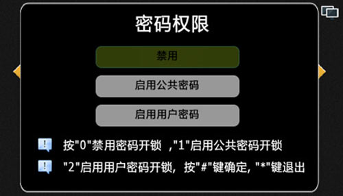 1) 設備出廠默認開鎖為禁用,按照界面提示,“0”選擇禁用,系統將無法使用開鎖密碼來開啟門鎖;“1”啟用公共密碼開鎖,用戶可通過公共開鎖密碼開啟門鎖;“2”啟用用戶密碼開鎖,用戶可通話用戶開鎖密碼開啟門鎖。“*”鍵退出,“#”鍵確認,設置界面如圖4.5.1: