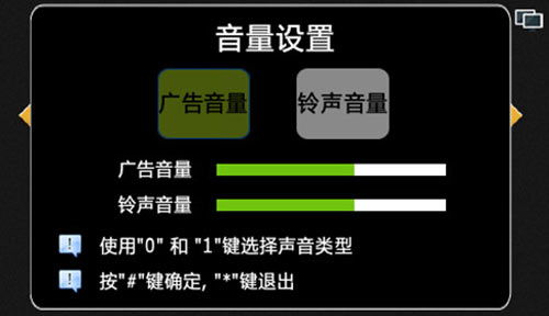 1)可設置廣告音量和鈴聲音量,按“0”選擇廣告音量選項,按“1”選擇鈴聲音量選項,按“4”減小音量,按“6”增加音量,如圖4.6.1:
