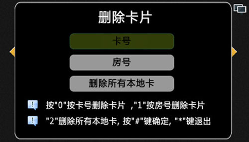4) 按“1”選擇刪除卡片,進入下一級菜單,如圖4.12.4,按“0”按照卡號來刪除卡片,按“1”按照房號來刪除卡片,按“2”刪除所有本地發出的卡片。