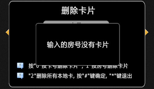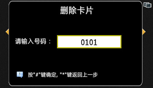 按“1”+“#”選擇房號后,輸入需要刪除所有卡對應的房號,如果在單元機上需輸入4位房號,例如0101,如圖4.12.6,如果在圍墻機上需輸入10位房號,例如0102010101。若該房號存在IC卡,則刪除該房號的所有住戶IC卡;若輸入的房號沒有卡片,則提示輸入的房號沒有卡片,如圖4.12.7: