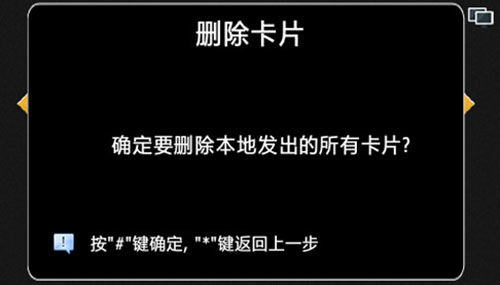 按“2”+“#”選擇刪除所有本地發出的卡片,提示確認要刪除本地發出的所有卡片,按“#”鍵確認刪除,按“*”鍵返回上一步,如圖4.12.8:
