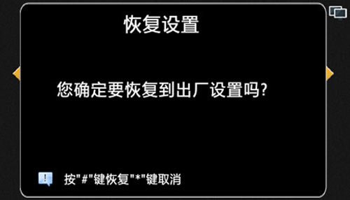 1) 點擊恢復設置按鈕,選擇是否恢復到出廠設置,按“#”確定恢復出廠,按“*”取消恢復出廠,如圖4.13.1: