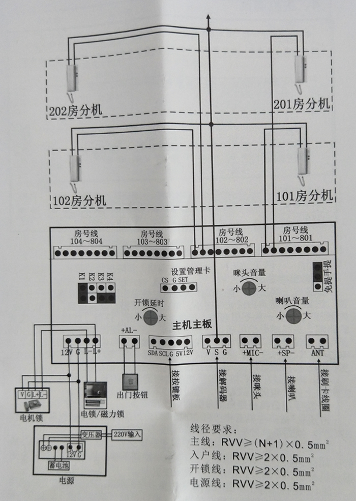 主機面板有“0~9”的數字按鍵,來訪者輸入三位或四位的房號(例如0203,按順序按鍵盤的“0” “2”, “O” ”3”按鍵即可),如按錯,可按“*”字鍵取消,重新輸入正確的房號,呼叫成功時對應分機會發出音樂鈴聲,以提示用戶有訪客到。用戶摘機即可與訪客互相通話,住戶確認訪客身份后,可按開鎖鍵,遙控開啟樓下大門電鎖。(注:該系統最多支持32戶,所以房號范圍是0101、0102、0103、0104-.. .. 0801、0802、0803、0804)