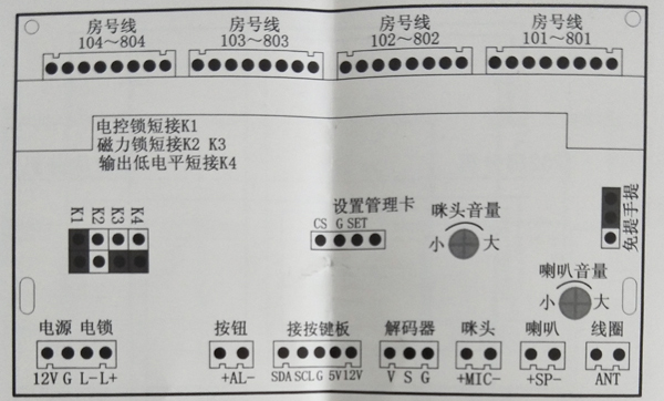 安裝施工調試時,安裝工作人只可以根據現場環境的需要進行一些調整, 比如:通話聲音過大或過小,可以稍微調整“咪頭音量”的電位器(如圖5所示),一般不用調整。 設備受施工場所、環境、線材質量等因素的影響,主機或分機可能會出現嘯叫吉。如果出現此類情況,安裝工作人員可以通過調整“咪頭音量” 和“喇叭音量” 的電位器(如圖5所示)。