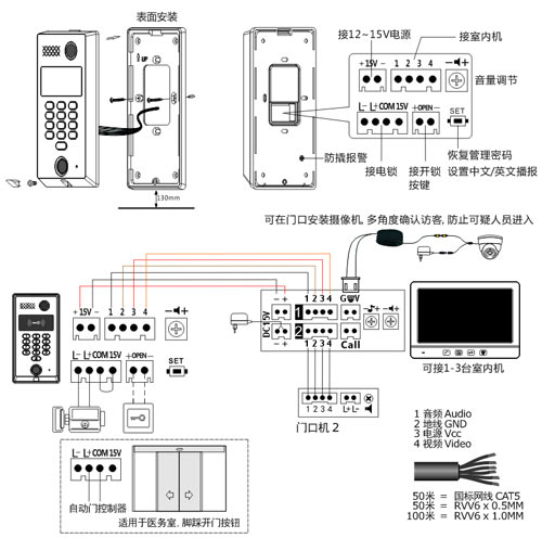 門口機功能: 可接室內(nèi)機, 可實現(xiàn)呼叫、視頻傳輸、雙向?qū)χv、開鎖功能。